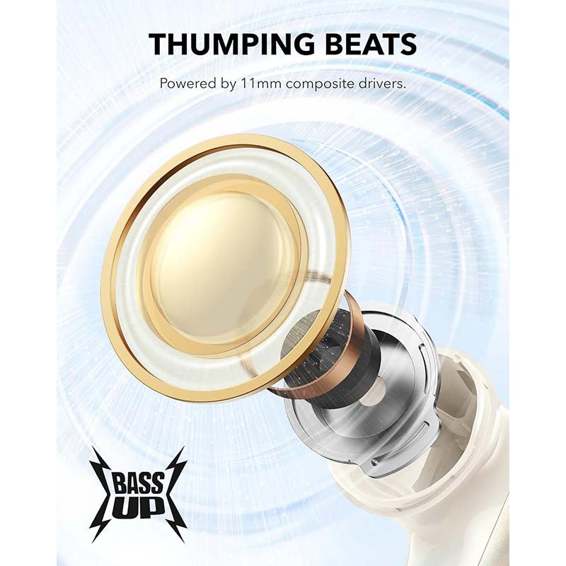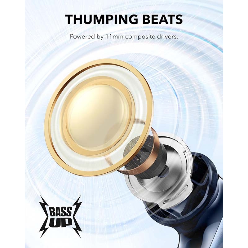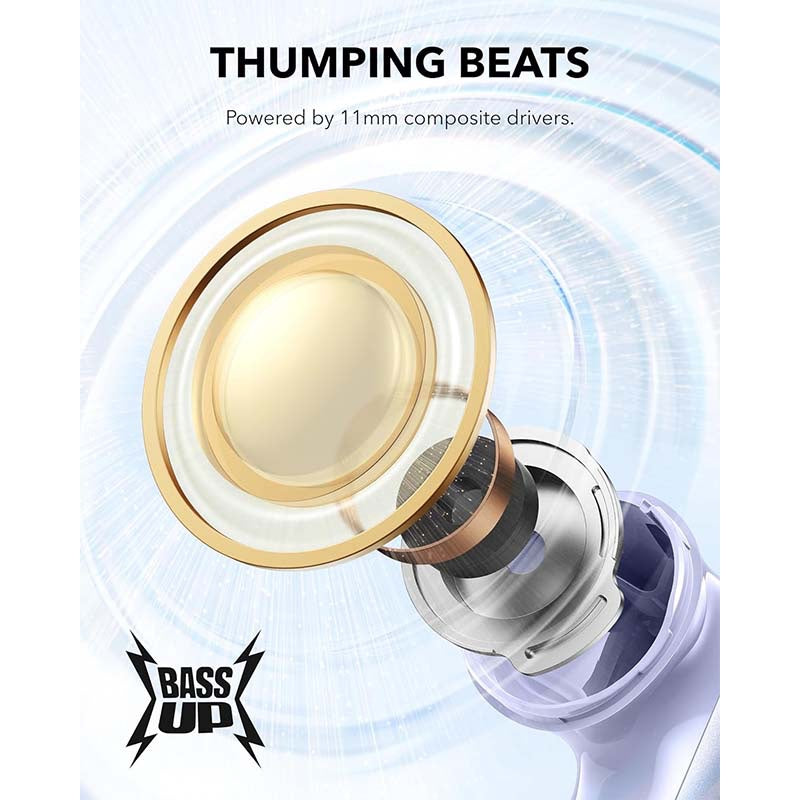 · Thumping Beats: soundcore P40i wireless earbuds feature 11mm composite drivers for an intensive audio experience, enhanced with BassUp technology for real-time intense bass.